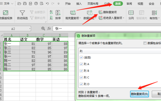 - 选中需要去重的数据区域